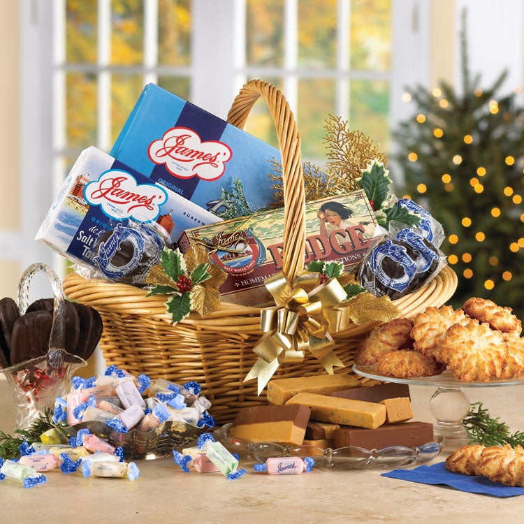 The James' Seaside Basket of Candy is overflowing with waves of tasty treats including assorted Salt Water Taffy, Boardwalk Fudge, Coconut Macaroons, and Chocolate Covered Molasses Paddles.